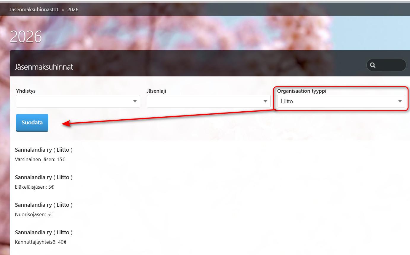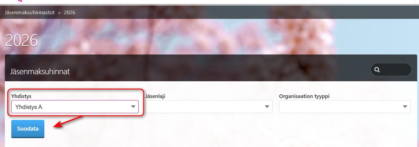 Liittotason osuudet / hinnat saat päivitettyä suodattamalla ko. organisaatiotyypin ja avaa se jäsenlaji, jonka hintatiedon haluat päivittää. Korvaa vanhat hinnat uusilla ja päivitä hinnat.