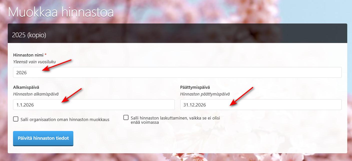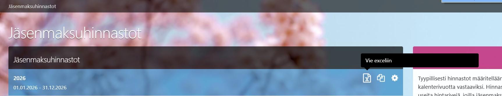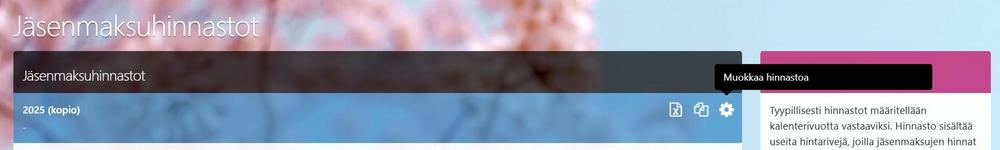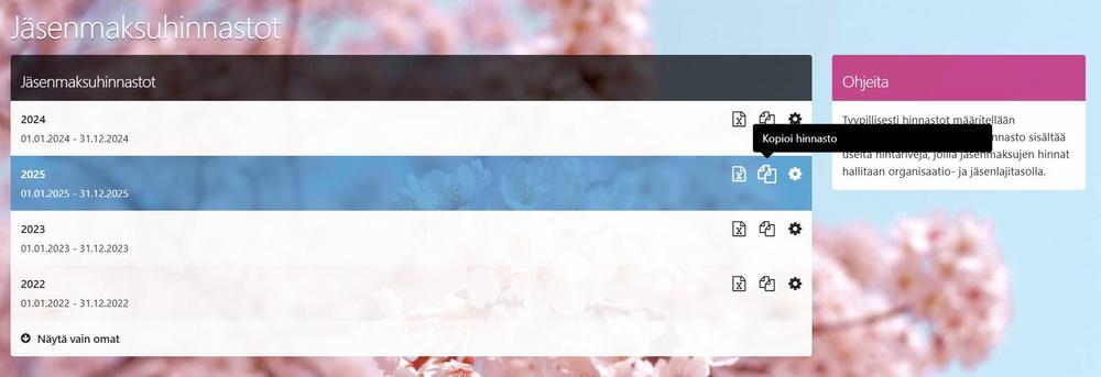 Jäsenvuoden vaihtuessa voit kopioida edellisen jäsenvuoden hinnaston ja päivittää siihen muuttuneet hinnat. Tämä on kätevä toimintatapa silloin, kun muutokset ovat vähäisiä ja/tai hinnasto sisältää paljon yhdistyskohtaisia hintatietoja.