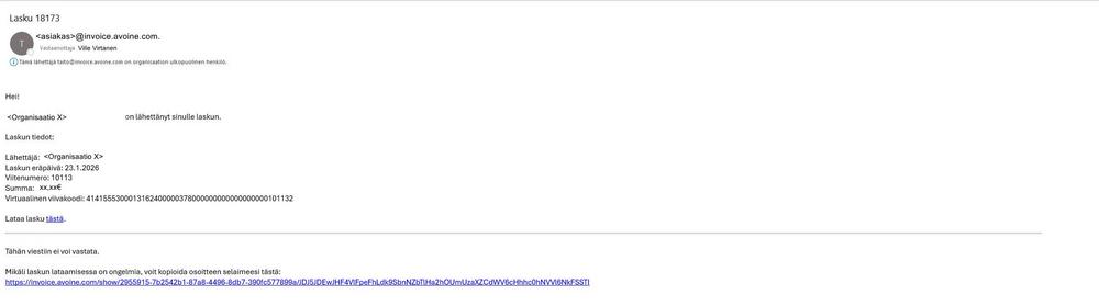 Jäsenlaskujen lähetysosoitteena on aina <asiakas>@invoice.avoine.com.