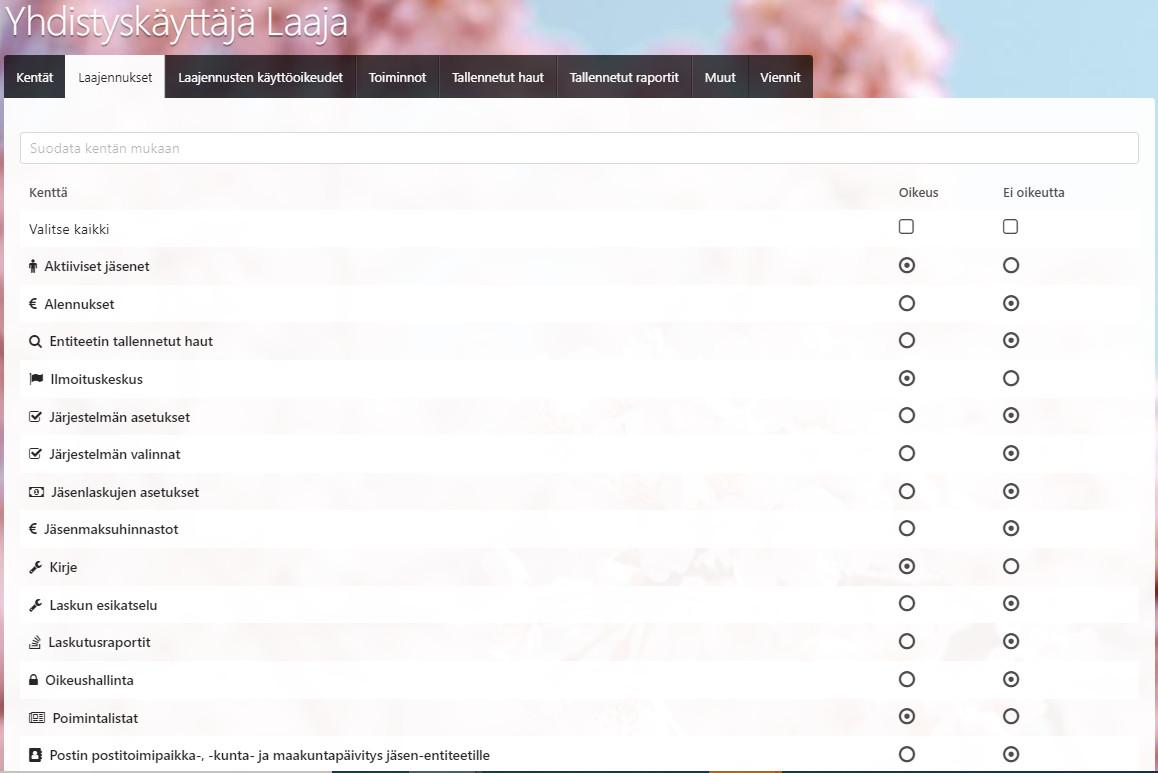 Tämä osio sisältää rekisterin työkalujen ja toimintojen oikeusmääritykset. Nämä asetellaan kuntoon useasti projektin aikana ja suurin osa on hyvä avata vain pääkäyttäjälle.