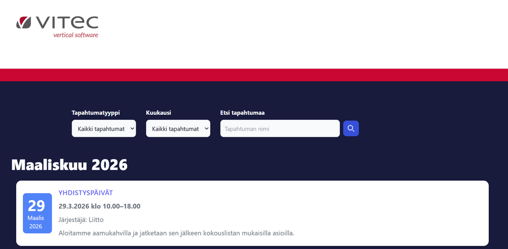 Tapahtumat listautuvat tapahtumakalenteriin, jonka visuaalinen ilme on mukautettavissa värimaailman ja logon osalta. Kalenteri on mahdollista upottaa osaksi liiton kotisivuja tai se voidaan sijoittaa linkin takaa avautuvaksi.