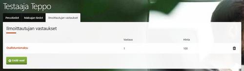 Ilmoittautujan vastaukset -välilehdelle tallentuvat tapahtuman Maksut ja lisäkysymykset -välilehden rivikohtaiset vastaukset.