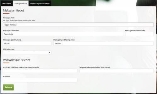 Maksajan tiedot -välilehdelle tallentuvat erillliset maksajatiedot sekä (yrityksen) verkkolaskutustiedot.