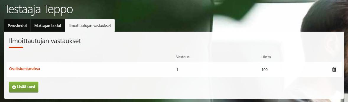 Ilmoittautujan vastaukset -välilehdelle tallentuvat tapahtuman Maksut ja lisäkysymykset -välilehden rivikohtaiset vastaukset.