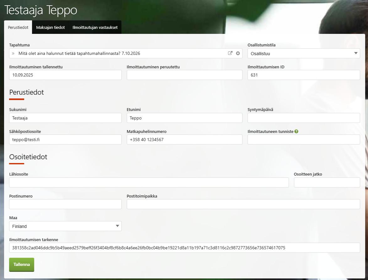Osoitetiedot täydentyvät, mikäli tapahtuman perustietoihin on määritetty, että nämä tiedot kysytään.