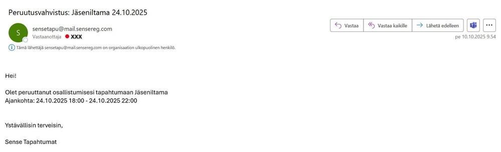 Vahvistusviesti osallistumisen peruuttamiseen liittyen