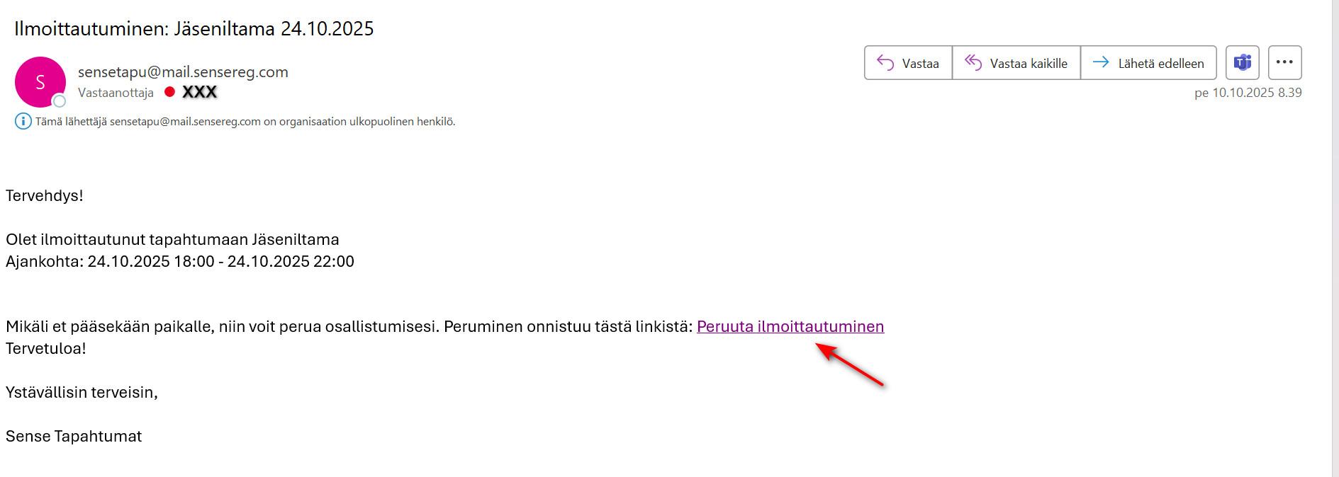 Linkin kautta tehtynä peruutus kohdistuu automaattisesti ko. henkilöön ja taustaprosessit käynnistyvät, esim. osallistumisen status ja osallistujamäärä päivittyvät.