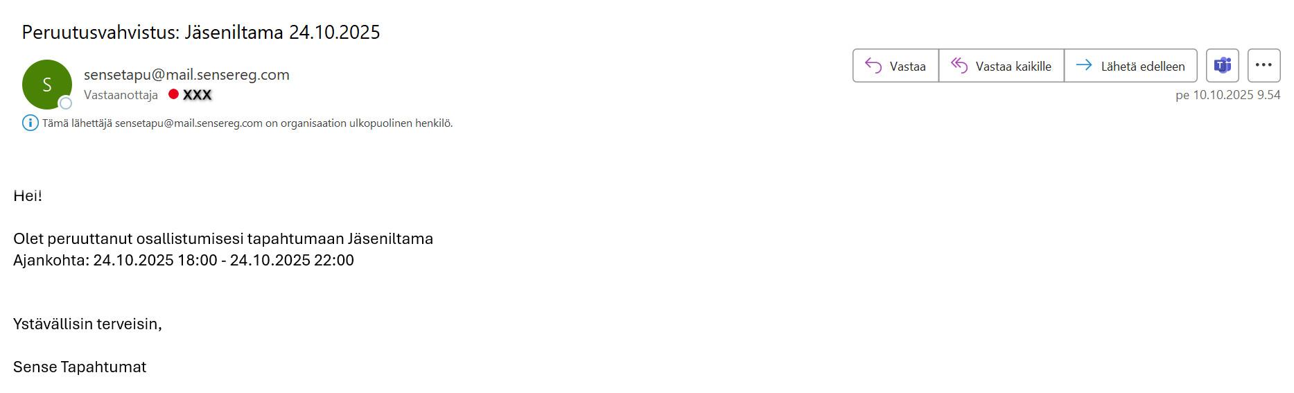 Vahvistusviesti osallistumisen peruuttamiseen liittyen