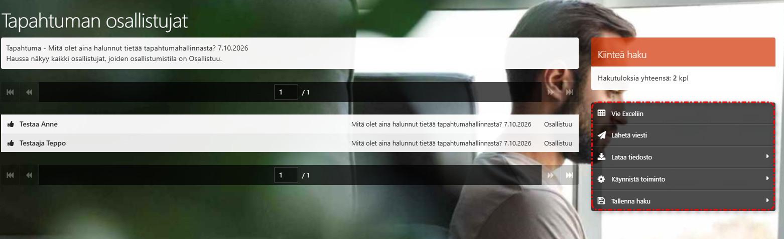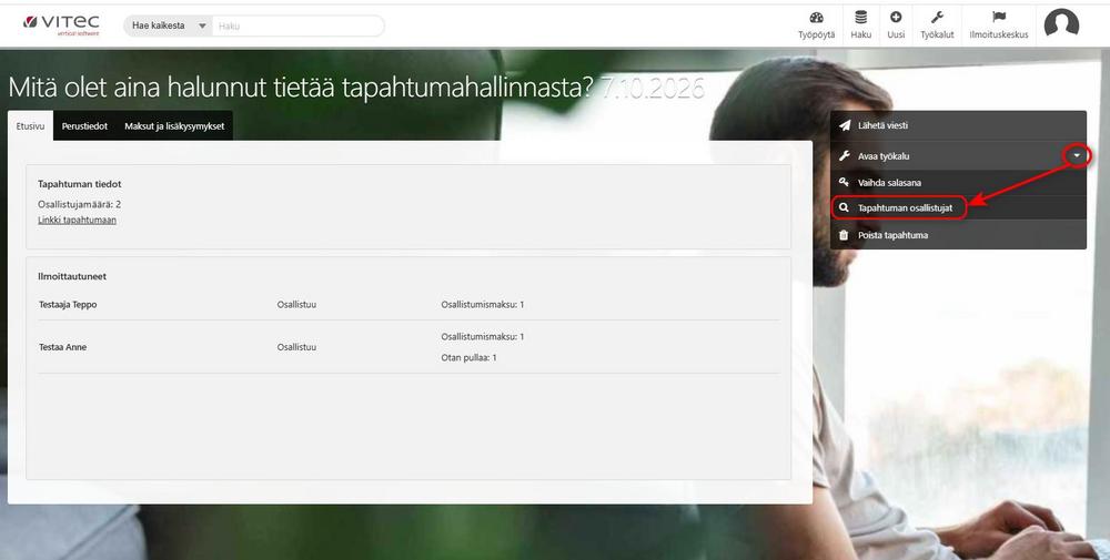 Tapahtumakohtaisen osallistujalistan saa otettua helpoiten tapahtuman tiedoista: Avaa työkalu > Tapahtuman osallistujat.
