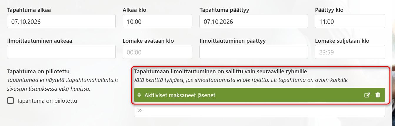 Määritä tämä haku tapahtuman perustietoihin Tapahtumaan ilmoittautuminen on sallittu vain seuraaville ryhmille -kenttään